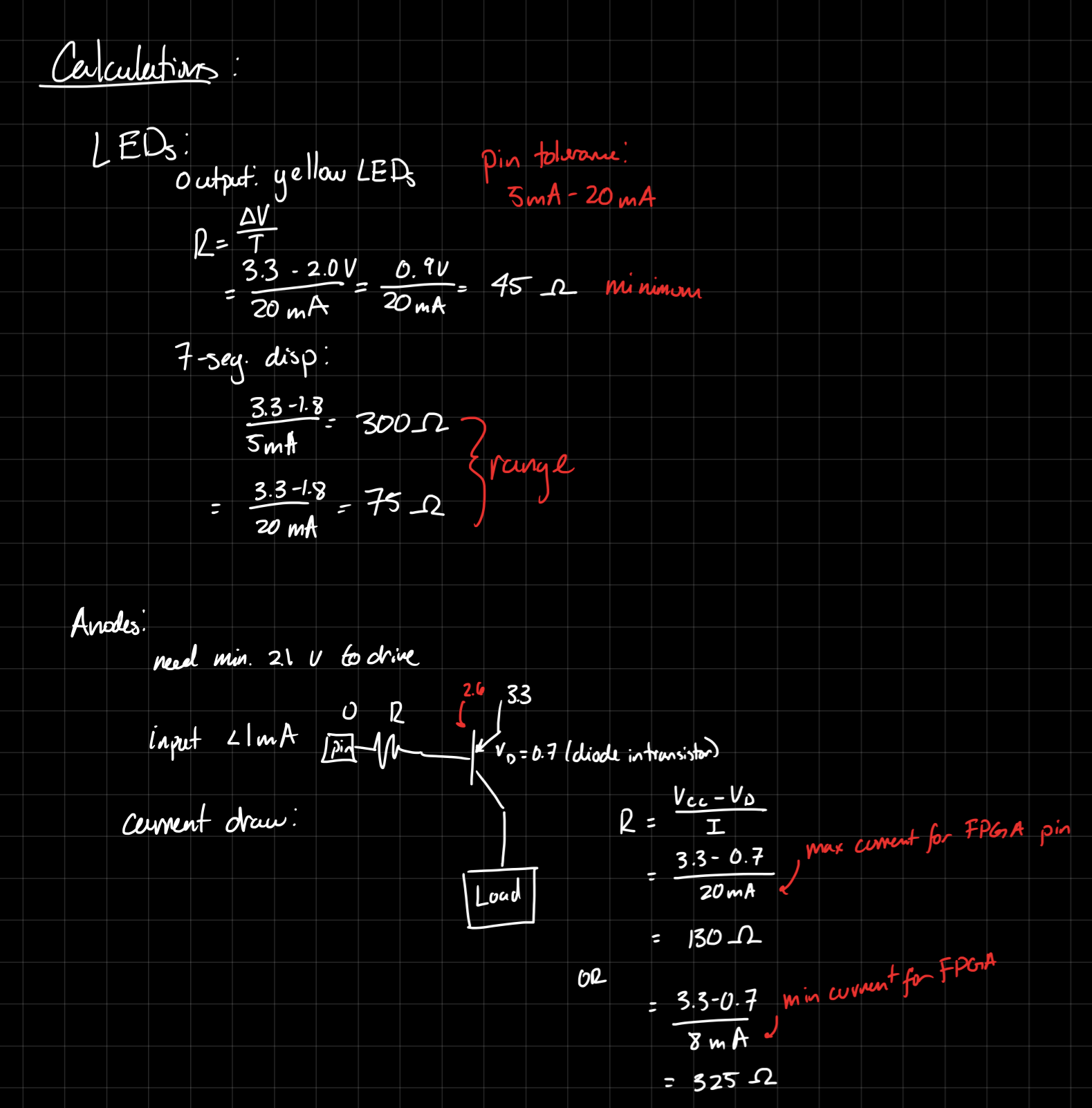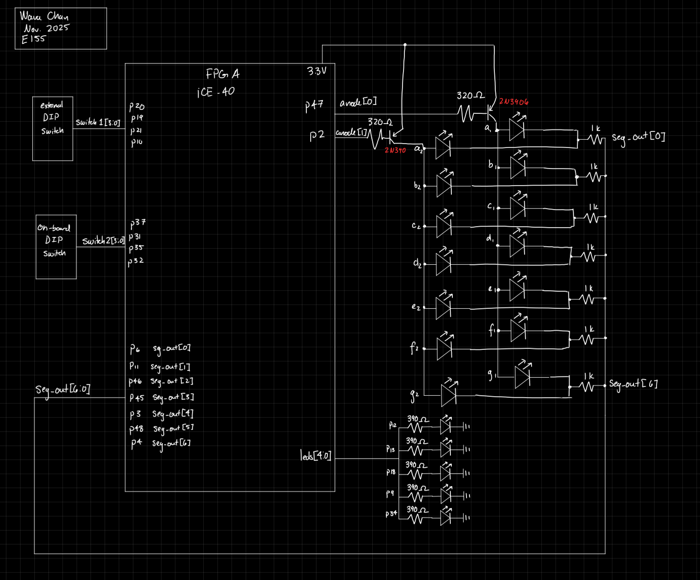 The common anode pins on the display were connected to FPGA pins, but these do not provide enough voltage to drive the pin. Thus, the signal to the pins was bolstered by a PNP transistor.