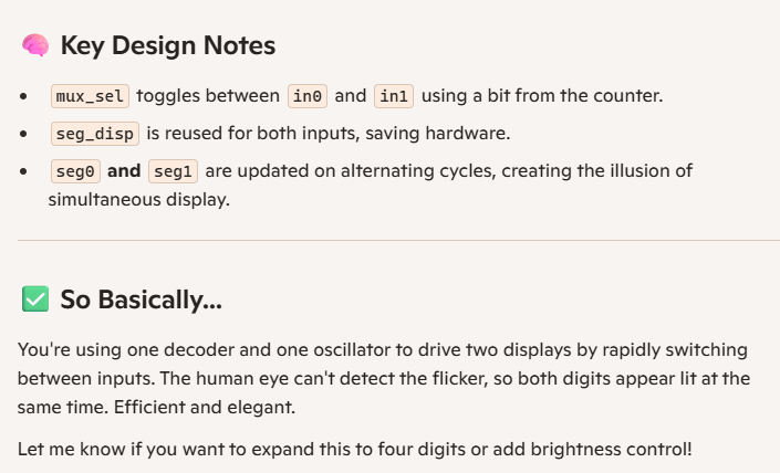 The circuit used all the FPGA pins, so there had to be multiplexing between the two displays to correctly display different values at the same time. This was done by driving either (not both) of the common anodes, turning each display on in turn, at a higher frequency than the human eye can detect.