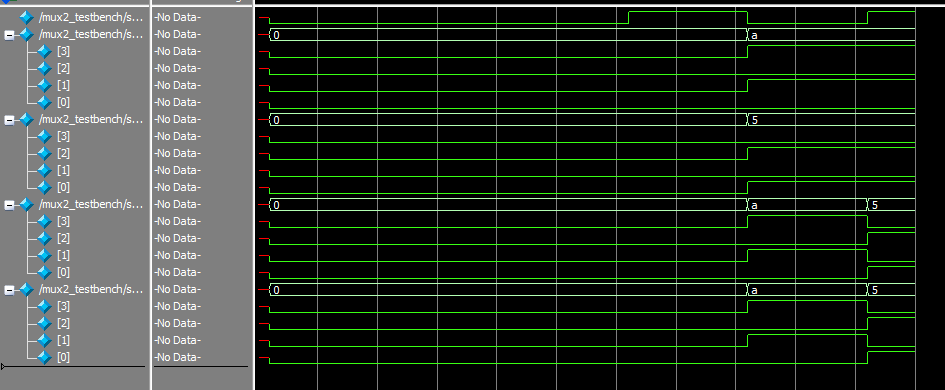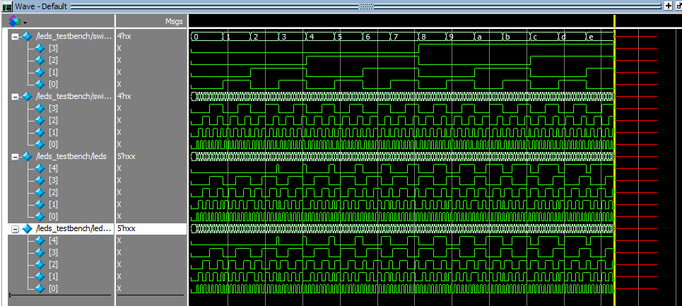 A simple testbench was created, testing every possible combination of switch inputs, and the output is as seen below: