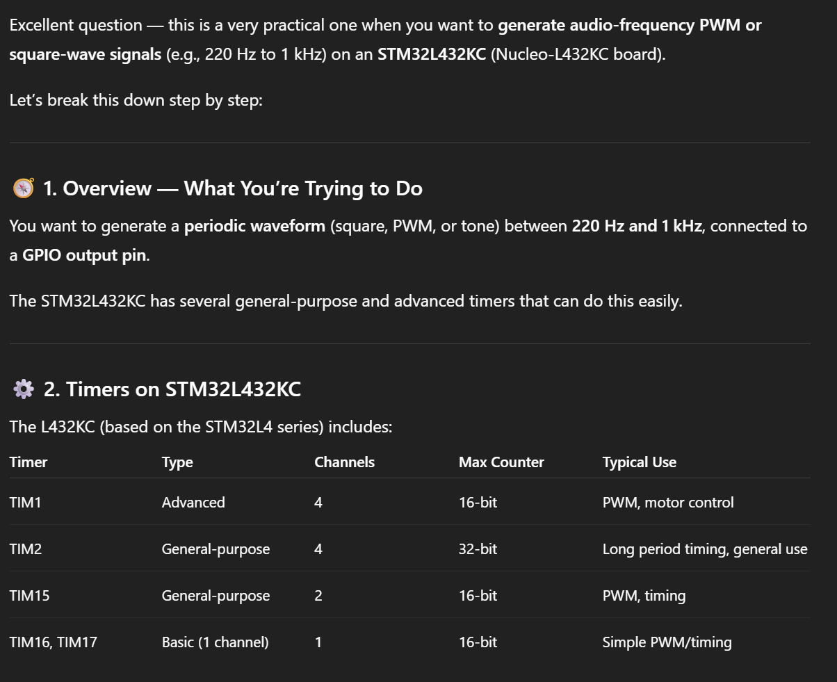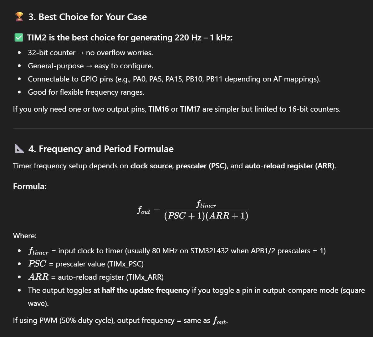 What timers should I use on the STM32L432KC to generate frequencies ranging from 220Hz to 1kHz? What’s the best choice of timer if I want to easily connect it to a GPIO pin? What formulae are relevant, and what registers need to be set to configure them properly?