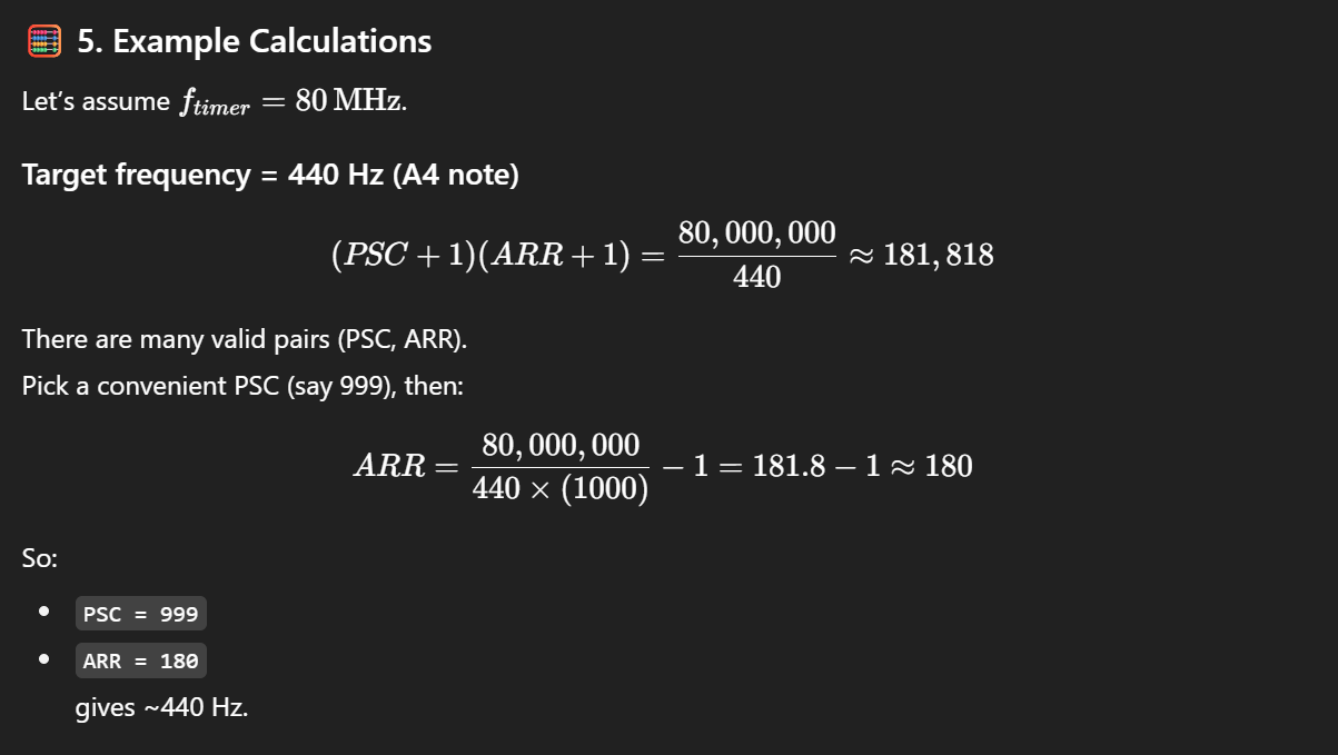 Additionally, the maximum and minimum pitch and duration were all calculated. These are limited by the maximum size of the TIMx_ARR register, which is 16 bits, thus having a maximum value of 65,535. The minimum is due to the internal workings of the code.