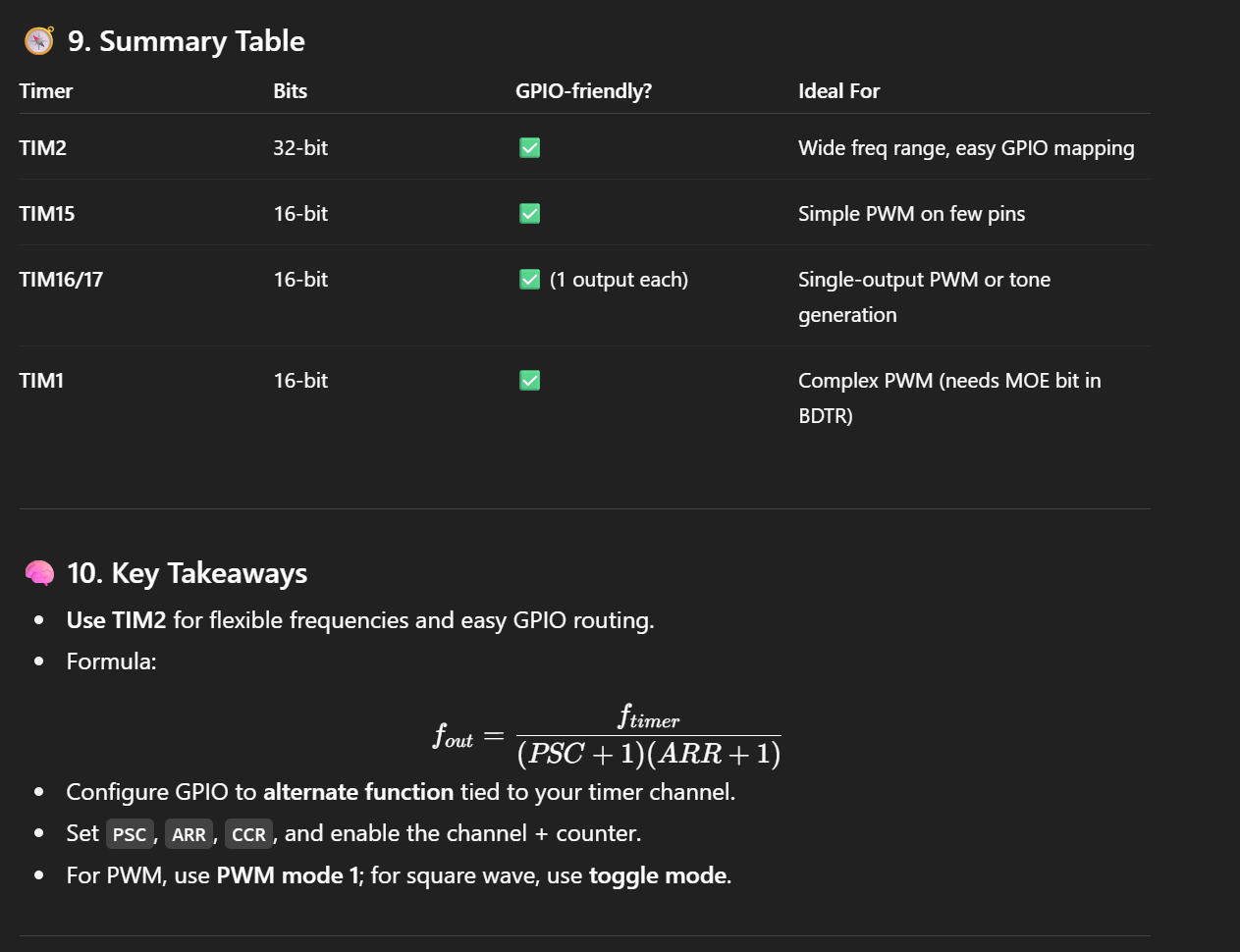 Claiming that TIM2 is the best choice is interesting– it does indeed have a larger maximum register value, widening the possible range. However, TIM2 is mor complex than TIM15 and TIM16, and simpler is better.