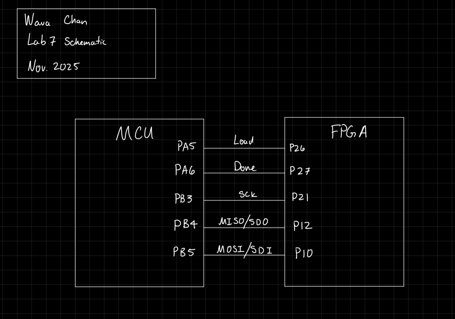 In this lab, an encryption process, following the AES Standard, was designed and implemented on an FPGA. Additionally, SPI communication was established between the FPGA and the MCU using wires on the provided development board. The MCU was used to send a plaintext message and a key to the FPGA, and the correctly encrypted message was sent back.
