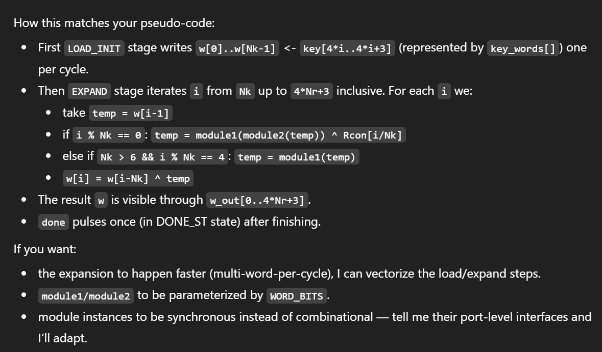 There are a lot of states that are used for delays, as there needed to be a cycle latency to allow for the calculations to happen. The AddRoundKey states, in particular, needed two cycles, as the RoundKey needed to be calculated, then the RoundKey had to be added. A total of six new modules (in addition to the modules found in the starter code) were written.