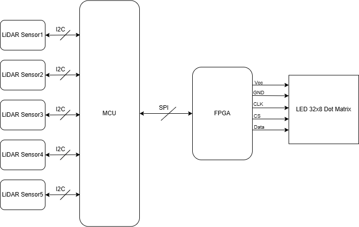 The main objective of this project is to build a rock-paper scissors game, where a human player plays against the computer. A LED Dot Matrix, driven by the FPGA, will display the computer’s play (rock, paper, or scissors), as well as any other pertinent information (score, countdown, etc). The player’s move will be picked up by a series of 5 LiDAR sensors. The five LiDAR sensors will be placed beneath the scanning platform and strategically positioned so that specific combinations of sensor activations correspond to particular game moves. The scanning platform will outline an area for players to position their hands, ensuring proper alignment and preventing misclassification of plays. Rock-paper-scissors provides three very distinct gestures