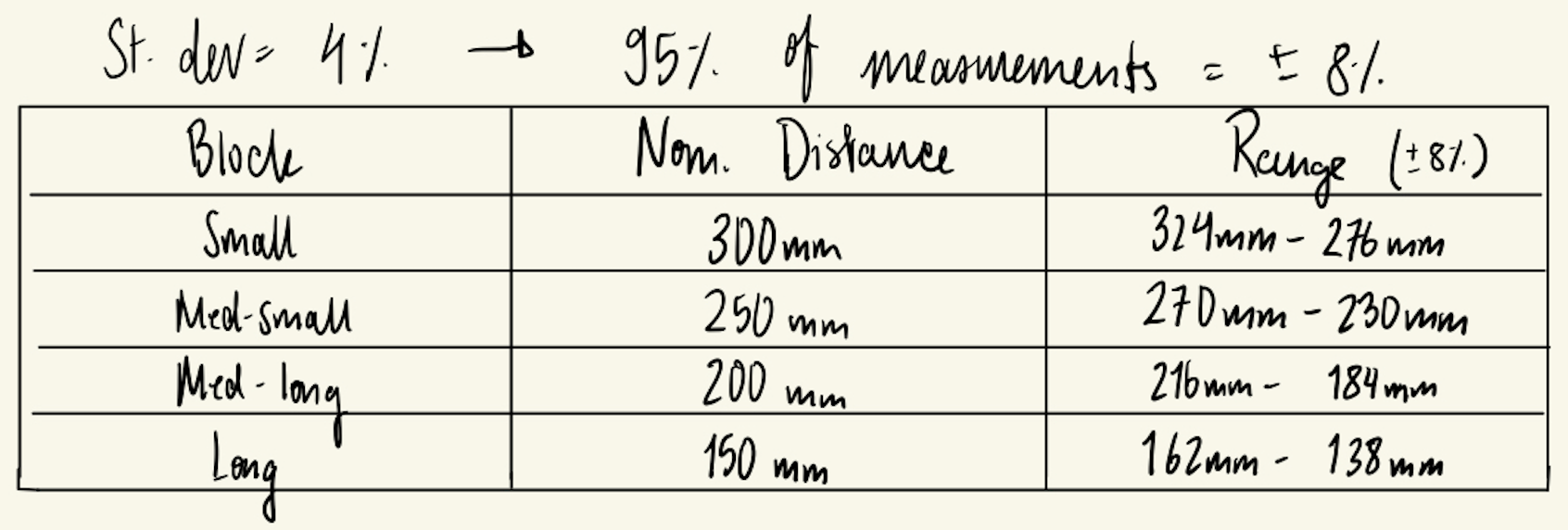 Using the recommended 33ms scan time while indoors with a white target, we are given that the standard deviation is 4%. Therefore, 95% of measurements will fall within ±8% of the true distance. We will account for this with the following margins.