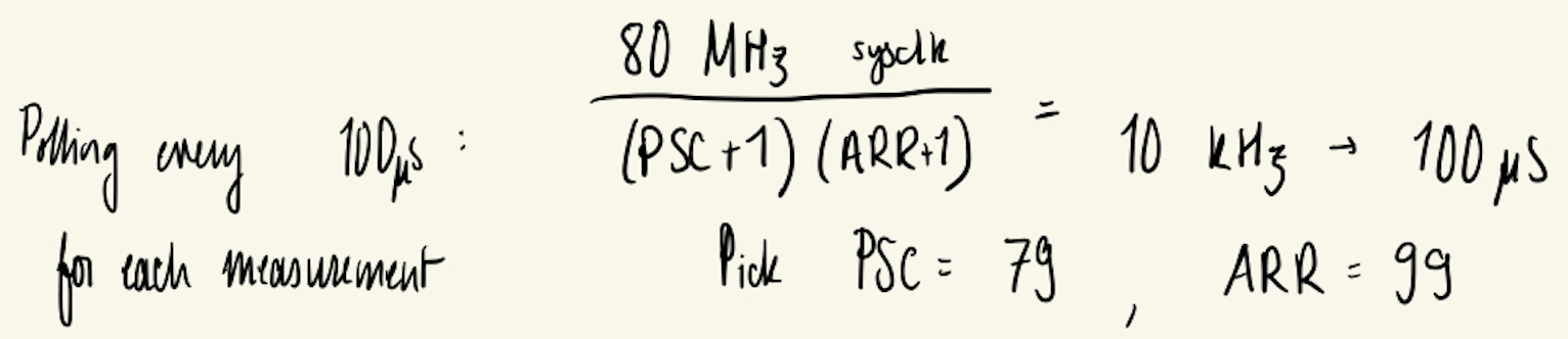 For each sensor, we will follow the recommended 33 ms of reading time + 2 ms for extra buffer. The host will poll at 10 kHz for measurement status. With Sysclk = 80Mhz: PSC=79, ARR=99.