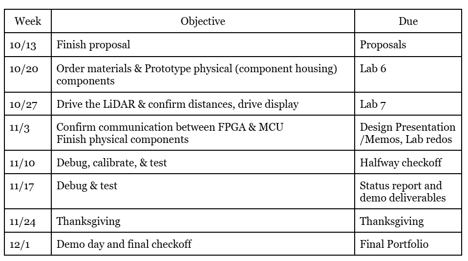 To portion the work, we will first create a shared github so we always have access to our main body of work. We will each take a task, and update the exact task week-by-week. It is important that we both gain experience with the LED Dot Matrix and the LiDAR, so we will both be aware of the development of the code, but more insight is gained in the debugging stage, so that is where we will prioritize working together.